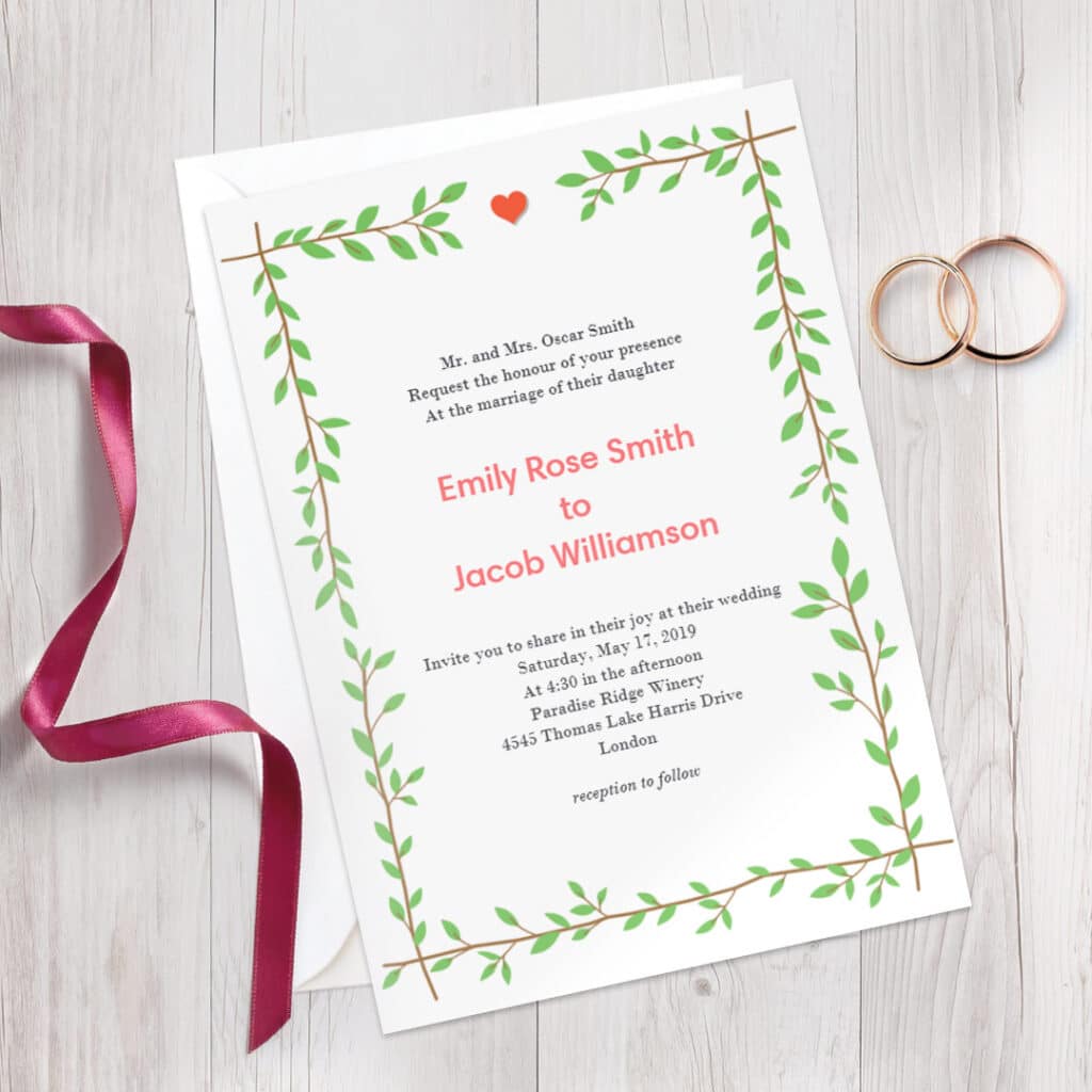 Something as simple as adding a border can really bring your invitations to life. Try our branches frame wedding card design to bring the perfect balance of sophistication and romance.